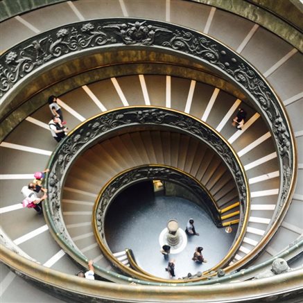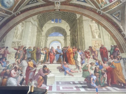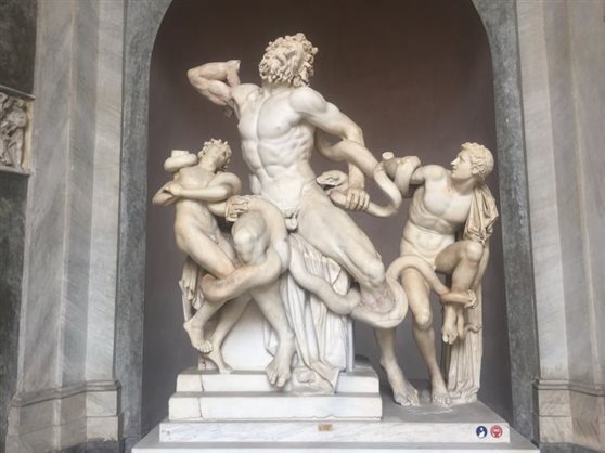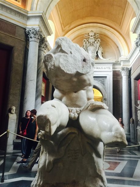 用过中餐后,雨势渐微,实习小组决定将圣彼得之旅放在明日上午,下午先去宗教之国梵蒂冈参观。在罗马小巷中七绕八拐之后,老师带着同学们过了安检进入梵蒂冈博物馆。从鲜活生动的古希腊与古罗马雕像开始,老师带着大家一一参观了如《拉奥孔与他的儿子们》、《躯干》等在艺术史上留有盛名的作品。接着,同学们参观了乔托、卡拉瓦乔、拉斐尔、达芬奇等大师的画作,从平面化的拜占庭风格到文艺复兴后期透视成熟,结构精准,光感真实细腻的画作,再到狂放肆意的现代艺术创作,这些瑰宝在写生实习小组眼前接连展现。在这座高大雄伟的博物馆内,承载着的是历史、艺术,是千百年来无数伟人所构建的不朽殿堂。
