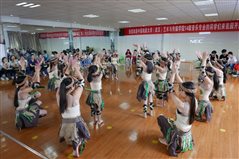 今天我们前往了利川市肉连响民族文化传艺馆,见到了刘守红老师。刘守红老师是肉连响的传人。“肉连响”,是湖北省利川市土生土长的、以独特的肢体表演为主要形式的少数民族地方舞蹈品种,流行在该市的都亭、柏杨、汪营一带,舞蹈主要以手掌击额、肩、脸、臂、肘、腰、腿等部位发出有节奏的响声而得名。“肉连响”以往曾称“肉莲湘”,动作与民间传统舞蹈“打莲湘”相仿。因舞蹈以其肉体碰击发出响声为其突出特色,乡民习惯称之为“肉连响”。“肉连响”舞蹈动作诙谐、明快,深受群众欢迎,但因表演难度大,动作要求高而使习艺者不多。解放前,“肉连响”只是一种行乞手段,表演的目的是为赢得主人的欢欣和同情,希望得到施舍。解放后,逐渐成为土家族乡民欢庆丰收和活跃市场的民族民间舞蹈品类之一。传习馆的老师和小朋友们为大家表演了以肉连响动作为元素改编的舞蹈,迎来大家阵阵掌声。刘老师不仅示范,还邀请我们的老师和同学们一起互动,教大家一些肉连响的基本动作。同学们也踊跃上台表演各自的才艺,气氛十分活跃。临走前,14级全体同学还向传习馆的小朋友们赠送了书籍和文具。