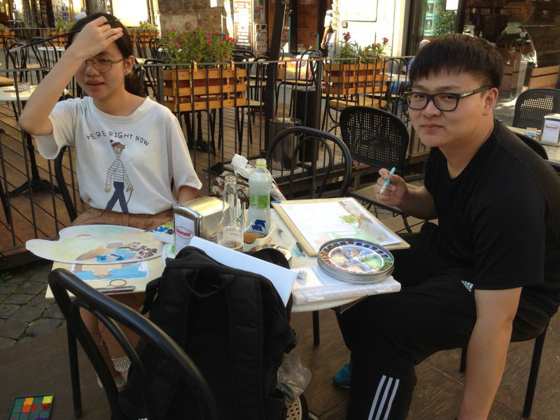 罗马实习小组自8月25日抵达意大利威尼斯之后,每天的活动安排非常丰富,有时候一天赶赴三个不同地点,体力消耗较大。尤其是威尼斯双年展,整天观展,脚不停步,还要吸收大量的新信息。开始几天,睡觉时间通常在半夜一点以后。9月1日没有安排外出,全天在斯波莱托写生,以便第二天的写生展览有更多的作品可供挑选,也为下一阶段罗马的高密度参观活动,放松调整一下。小镇居民看到写生的员工们非常可爱,从家里拿出水和甜点给大家,并邀请孩子们到家中,欣赏收藏的文艺复兴时期的圣母像。