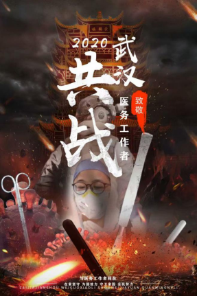 (设计说明:海报以抗战肺炎期间的一线医务人员为主体,以白描淡彩的方式呈现,突出白衣天使的伟大。背景以一系列的剪影组成,有代表武汉的黄鹤楼,肺炎的罪魁祸首——冠状病毒,交代了背景和当前形势。前面的大字“致敬英雄”以苍劲有力的笔触给出,预示这这场无声的战役终会以我们的胜利告终。冬天来了,春天还会远吗?)