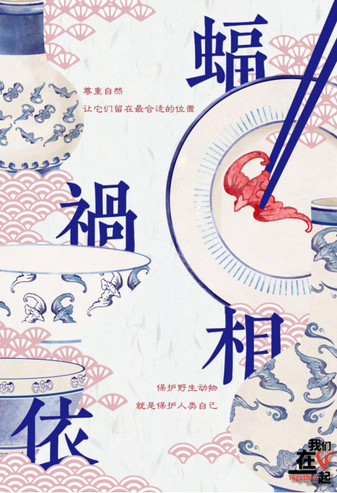 (设计说明:整个画面由哭泣的女孩、蝙蝠和口罩组成,意在警示人们拒绝食用野生动物、拒绝野味餐厅,谨防病从口入,酿成大祸。)