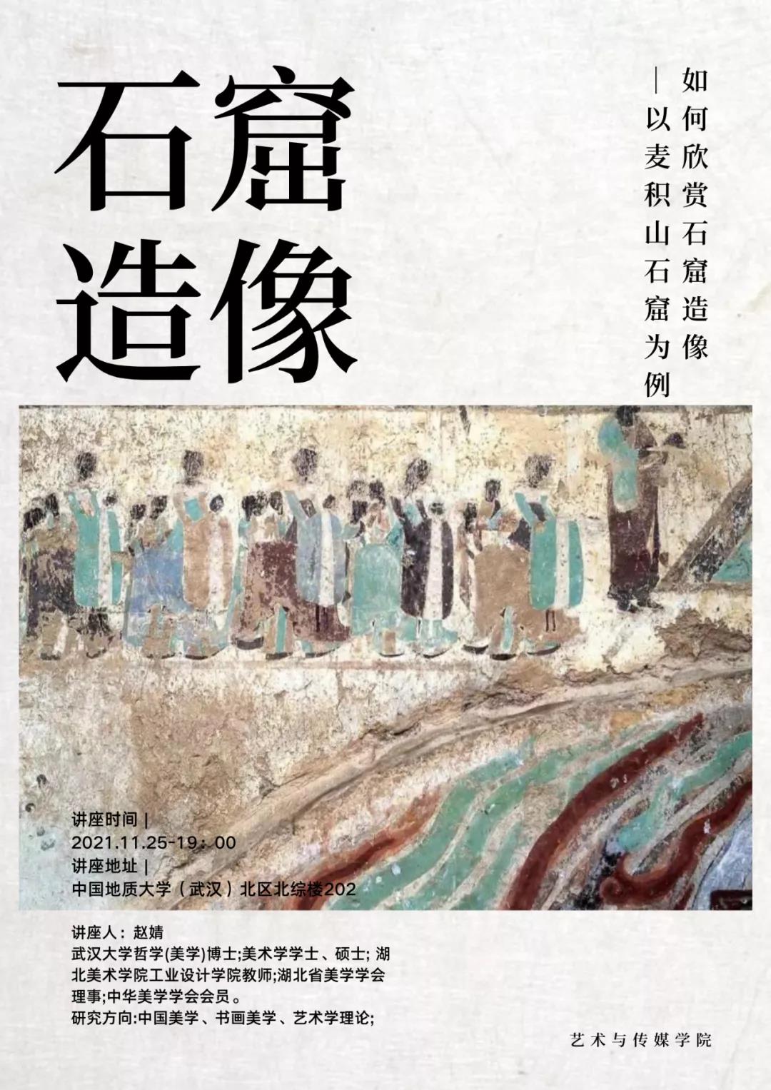 讲座开始,赵婧老师简要介绍了自己的研究内容,然后以麦积山石窟造像为例,开门见山地引出了本次讲座的主题——如何欣赏石窟造像。首先,赵老师为我们介绍了麦积石山窟的历史背景、开凿建造历程等概况知识。随后她详细解说了该石窟造像、泥塑的形象、题材、表现形式、材料运用、造像技法、审美风格等相关知识。