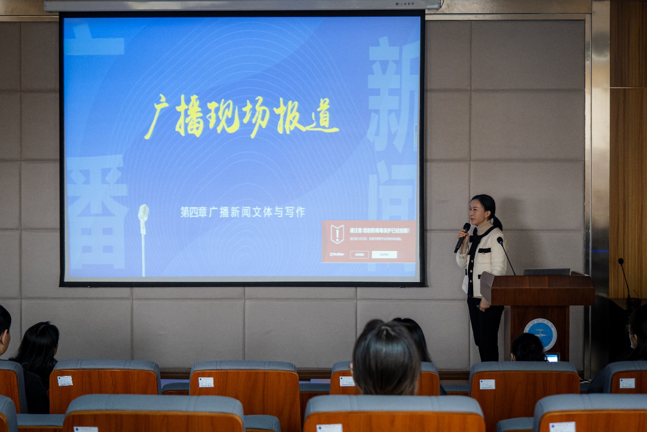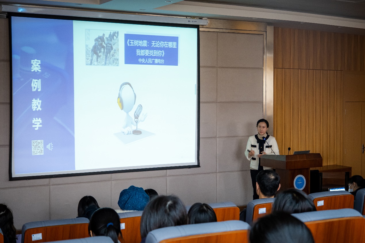 丁洁老师主讲的《广播新闻业务》课程是广播电视学专业主干课,在课程讲授中,丁老师结合十多年新闻一线实践经历,运用线上线下相结合的多元手段,发挥校媒协同实践教学基地优势,着力培养具有牢固马克思主义新闻观的广播新闻复合人才,目前多位员工的音频作品在省级平台播出,多部作品获得省级竞赛奖励,课程教学取得了实效。 在观摩展示中,丁洁老师选取了《广播现场报道》这一教学片段,从概念、原理到方法进行由浅入深、层层相扣的详细讲解,并运用大量中国新闻奖案例对原理进行配套讲解,增强员工对课程理论的理解。课程讲授注重发挥员工主体作用,在难点处设置课堂讨论引发员工思考,在重点处设置案例讲解和课程实践,提升员工的理解程度和实践能力。