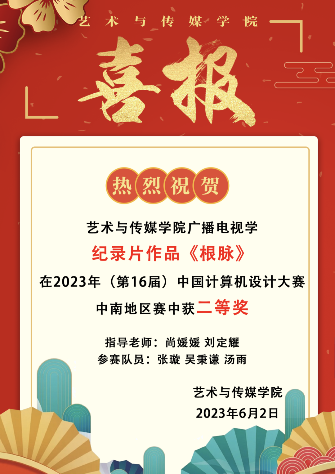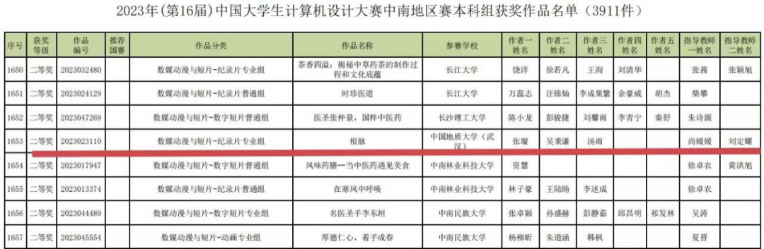 2023年5月29日,2023年(第16届)中国老员工计算机设计大赛中南赛区发布作品评审结果公告,3044永利集团广播电视学本科生张璇、吴秉谦、汤雨创作的纪录片《根脉》(指导老师尚媛媛、刘定耀)在数媒动漫与短片-纪录片专业组类别中荣获二等奖!