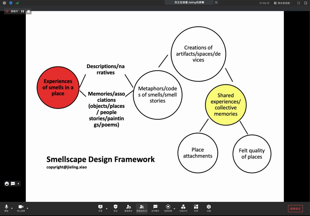 第二部分,肖捷菱教授讲到气味有让人回忆有关人、事、场景的特性,谈到做有气味元素设计时要考虑气味的作用、源头、持续时间 、消费市场和气味设计的道德性。同时肖教授也分享了她研究中提出的气味景观(smellscape)设计框架。还谈及了气味的故事性,用伦敦的Dennis sever博物馆这一案例说明了气味的叙事性;也从气味的符号性元素、气味的使用、材料的气味举例说明了气味在设计中对人的影响。