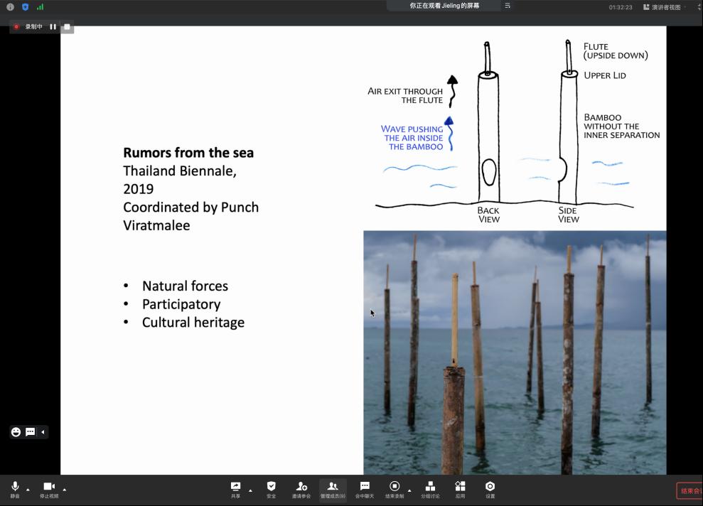 第一部分,肖捷菱教授从理论层面讲解声压级和声音频谱对人舒适度的影响,通过列举音乐厅对声音的反射和吸收引入不同材料对声音反射和吸收的差异,提到回声和混响的概念,讲解声音景观的概念;接着通过互动观看视频的方式说明了不同材料和空间结合,声音听起来会不一样,带给人不同的感受;用音乐展亭(Musical pavilion, 2022)、声音与历史文化遗产结合(80Hz pavilion, 2018)、“海哨子”(Rumors from the sea, 2019)等一系列案例说明声音在艺术设计领域的应用,用独特的视角给人不一样的视听体验,诠释了声音的功能性、启发性和作为情感性的纽带的特点。