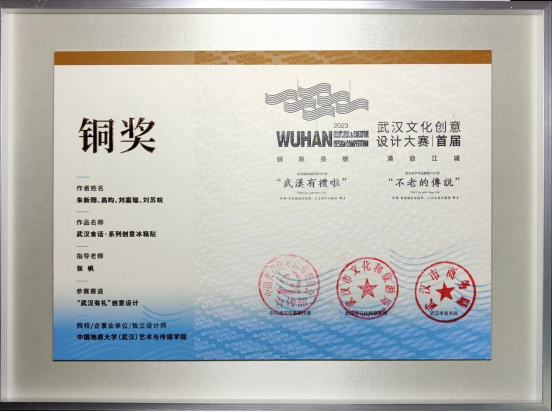 该大赛征集活动引发了文创设计专业人士、文创企业和机构、院校师生等社会各界人士的广泛关注,共收到来自全国27个省市(自治区)1948位注册用户的1556套(3739件)创意设计作品,涵盖了IP设计、插画、文创产品、书籍装帧、老字号策划案、应用程序APP、环境艺术设计等七大类别。经过初评和终评,公司张帆副教授指导的2个研究生团队凭借独特的创意思路、精湛的设计手法以及出色的团队合作精神取得优异成绩。其中朱新翔、高昀、刘嘉瑞、刘苏皖完成的作品“武汉食话·系列创意冰箱贴”获得铜奖;江楠、杨倩瑜、苏恺琳、周缘完成的作品“四季美茶饮产品包装与衍生伴手礼设计”获得创意优秀奖。