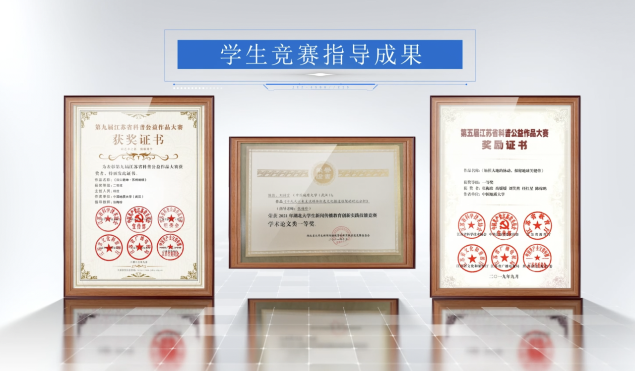 员工苏慧在参与课题研究方面基础厚实,就吸纳她参与导师社科基金等重要课题进行调研、学术交流等,该同学现已在地大攻读博士学位,发表多篇T2论文;曹欣怡、陈欣在学术论文写作方面具备潜质,就带领他们从选题、文献、方法和写作技巧等方面加以训练,发表多篇T3等级别论文;陈佳玥、熊雅雯在专业实践和艺术创作方面独具优势,通过各种专业竞赛、大型活动、科普宣传等完成了一系列科普视频、宣传片以及各种大赛作品,多次获国家级、省级老员工广告艺术大赛、科普微视频大赛奖项。
