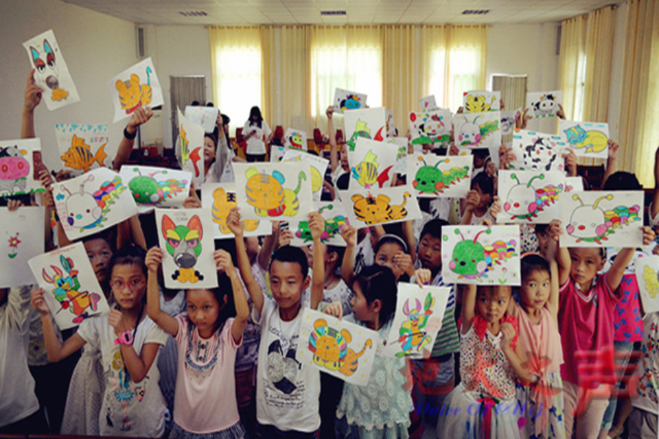 (2015年绘画课上孩子们举着作品合影 )