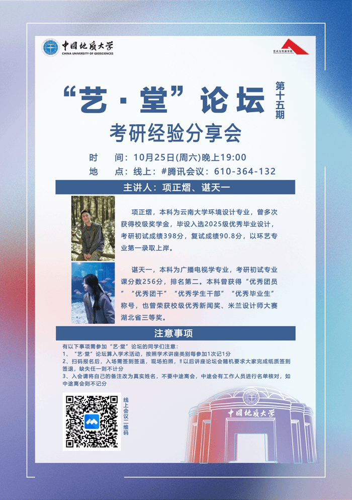 为帮助同学们明确考研方向、优化备考策略,10月25日晚上19:00,3044永利集团“艺・堂”论坛第十五期(学风建设系列第八期)考研经验分享会在线上腾讯会议举行。本次分享会邀请环境设计专业考研高分上岸的项正熠与新闻传播学备考经验丰富的谌天一担任主讲人,为参会同学带来干货满满的考研指导,助力大家高效备战。