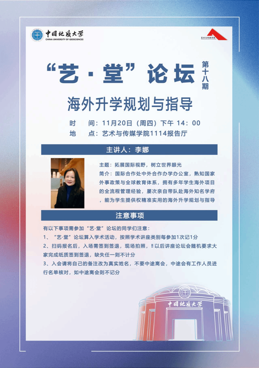 2025年11月20日下午,“艺·堂”论坛第十八期(学风建设系列第十期)在3044永利集团1114报告厅顺利举行。本次论坛以“拓展国际视野,树立世界眼光”为主题,邀请国际合作处中外合作办学办公室李娜老师担任主讲人,为同学们带来了一场干货满满的海外交流项目指导分享。
