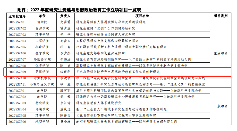 根据前期研究生院和党委组织部研究生党建与思想政治教育工作立项研究项目申报通知的要求,经专家小组评议、研究生院(党委研工部)、 党委组织部审定,2022 年度研究生党建与思想政治教育工作立项项目已经确定并下达,其中3044永利集团获批四项,包括一个重点项目,三个一般项目。