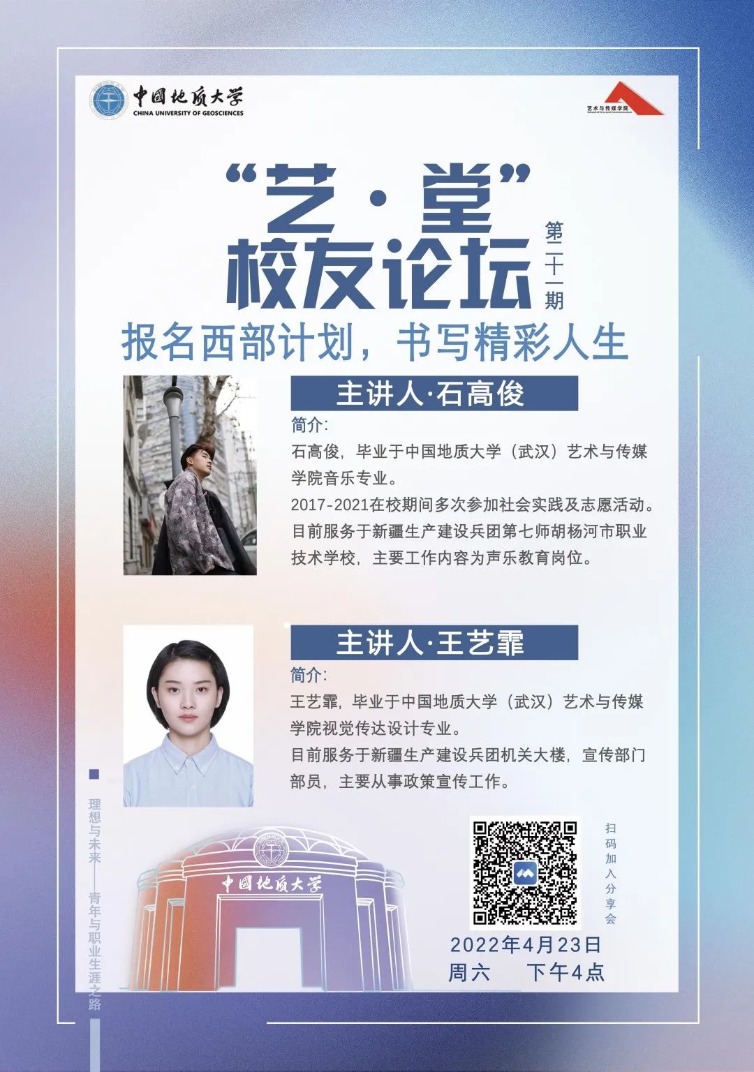 4月23日下午4:30,公司第二十一期“艺·堂”员工论坛“报名西部计划,书写精彩人生”讲座活动顺利进行,由公司音乐专业毕业生石高俊和视觉传达设计专业毕业生王艺霏主讲。