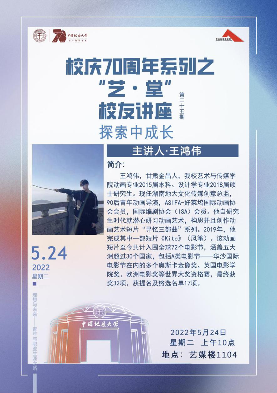 员工王鸿伟以自己的成长经历为主线展开了本次分享。童年时期的他生性活泼,是当地能说会道的“预言家”。但五岁之后由于环境的改变,他开始变得沉默寡言,这也恰巧让他与画画结缘,逐渐埋头于绘画创作,潜心于自己的小世界,也开始思考自己的人生。在经历青春期的叛逆之后,王鸿伟来到了地大,开始了人生的新篇章。研究生期间,他在动画领域不断学习和探索,毕业之后也毅然坚持完成自己的作品。谈及19年三月份某一个失眠的晚上,他非常激动,因为那是一个灵感涌现的夜晚,他连夜创作出记忆中那个小男孩的故事,即后来斩获多个电影节奖项的动画短片《Kite》(风筝)的雏形。谈及创作,他表示其中的过程无疑是漫长而孤独的,但也正因如此我们反而需要静下心来花时间去调整、去沉淀。回首过往,他将自己的经历总结为——“探索、成长”,他认为人生的道路应该由自己来把握,要学会享受别样的人生,经历独一无二的探索和成长的过程,然后淬炼成金、涅槃重生。
