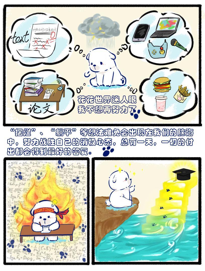 作者通过画笔绘出在老员工活中面对各种作业、论文、考试,我们难免会迷失自己,选择摆烂和躺平。我们应当想办法克服消极情绪,摆正心态,相信所有付出的努力,终会在未来的某一天得到回报。