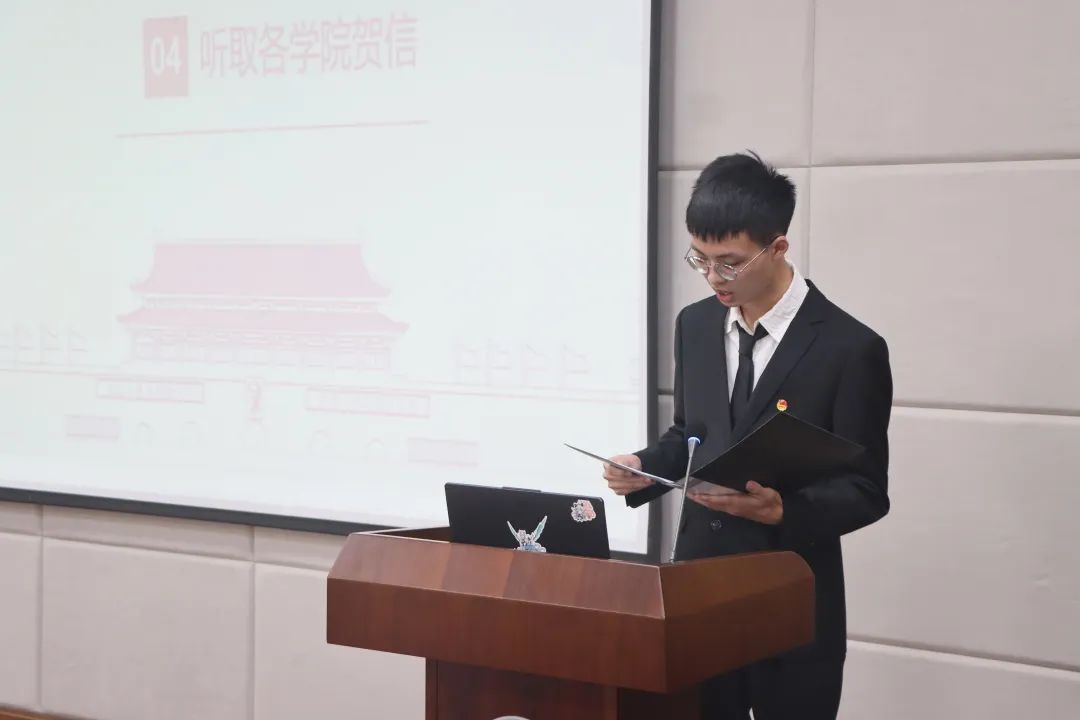 大会第七项,由主持人保悦宣读学代会总监票人、监票人、总计票人、计票人名单。本次大会的总监票人为赵书楠,监票人为黄益明、蒋雨晴、刘睿桢、许佳明。总计票人为易四维,计票人为曹欣、罗熙、胡心瑶、刘畅。参会人员通过举手表决通过此名单。